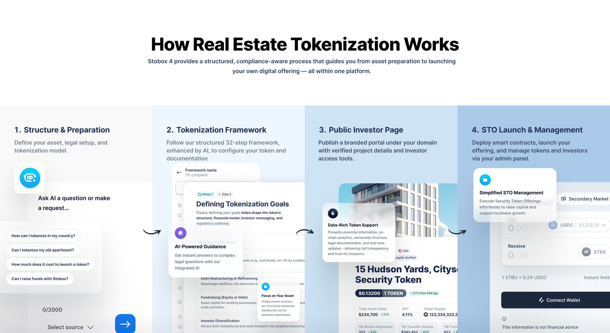 Successfully tokenizing real estate requires a carefully orchestrated process that spans legal, technical, and operational domains. Stobox's comprehensive methodology guides clients through each phase while maintaining institutional-grade compliance and security standards throughout the entire tokenization journey.