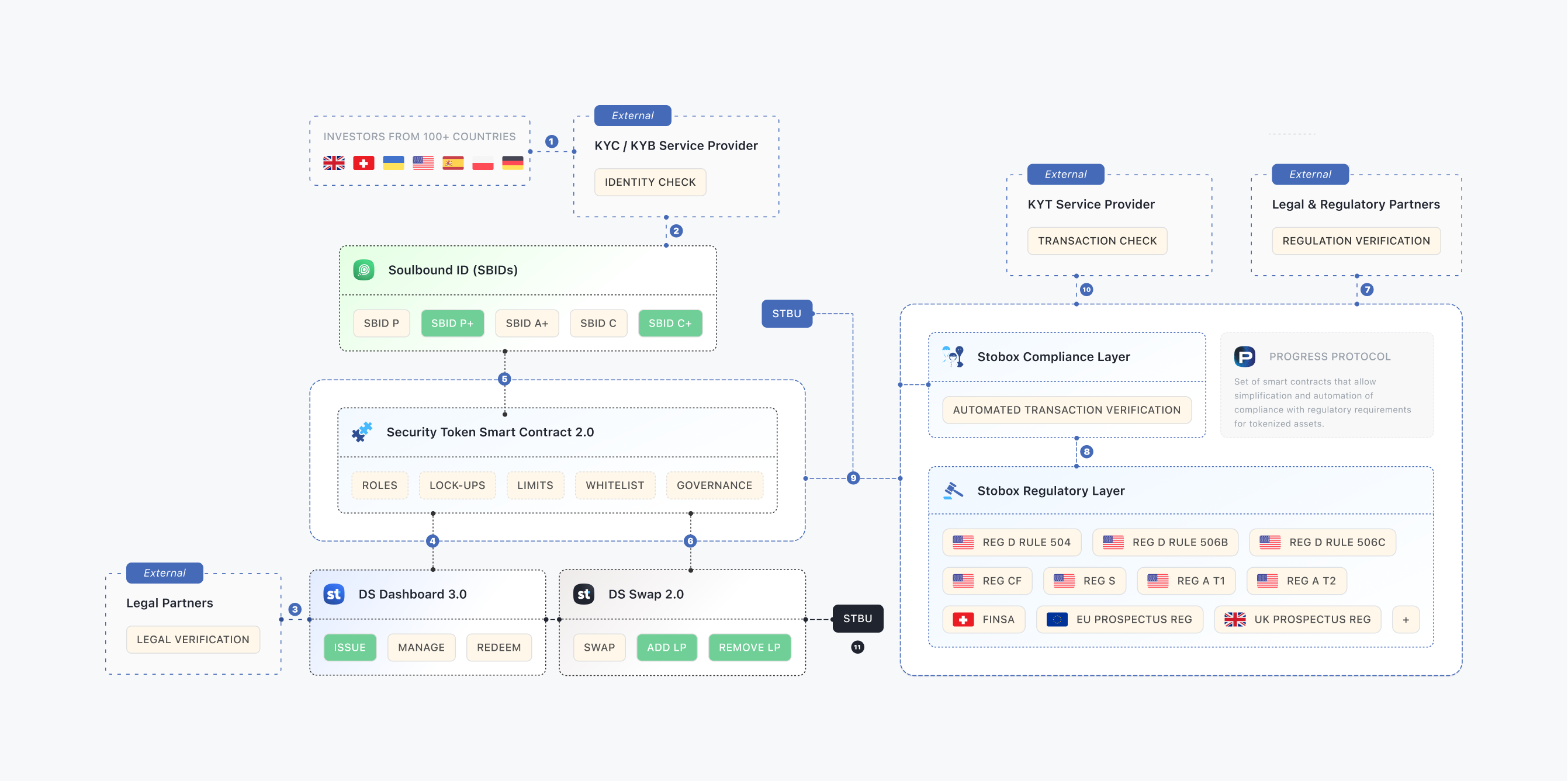 - The Progress Protocol is an optional part of the ecosystem. Tokenization can be used by companies that have their own compliance procedures and do not require the inclusion of additional automated checks. For those issuers who require such functionality, payment is provided at the level of verification of each transaction. For this, payment is charged in the form of a Stobox Token (STBU). The issuer using the Progress Protocol pays for compliance, where the Stobbox Token is automatically withdrawn for each check. In the future, more volume of compliance checks will result in more demand for the ecosystem's native token.