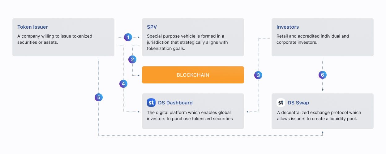 - Issuers manage investors, corporate actions, and investor relations via DS Dashboard.